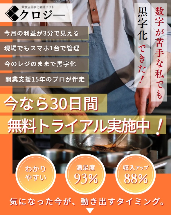 クロジーは創業15年のティーアップが、飲食初出店者の早期黒字化を創業当初からサポートするために開発、改良を重ねた会計ソフトで、経営の基本から集客・コスト分析、利益アップまでしっかり理解し、自分で改善できるよう仕組化されています。